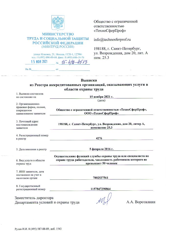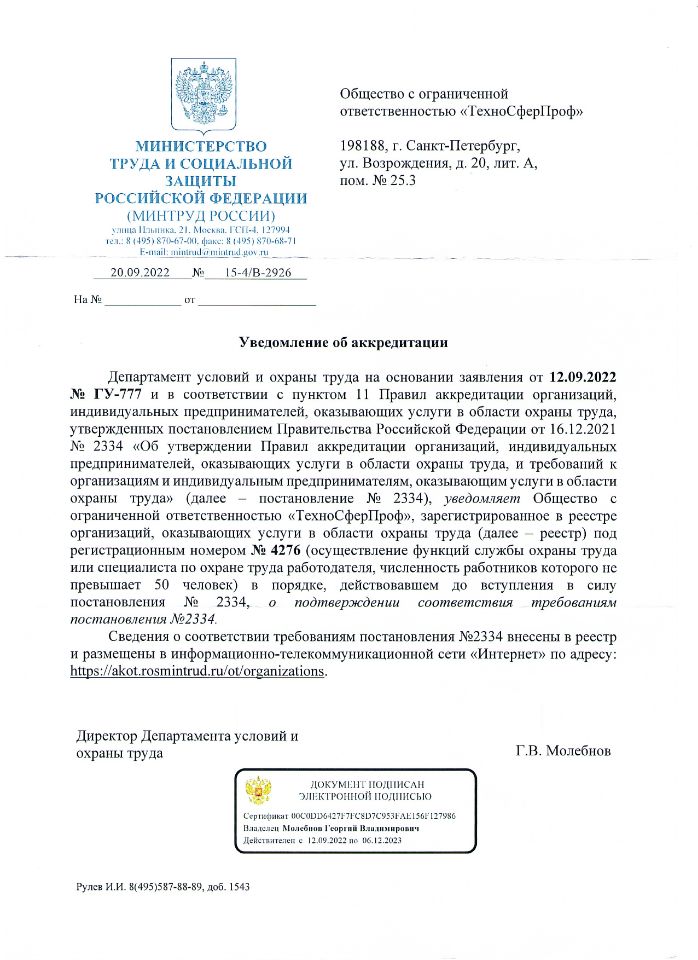 Компания ООО "ТехноСферПроф" одна из первых на территории Российской Федерации подтвердила соответствие требованиям постановления Правительства Российской Федерации от 16 декабря 2021 г. № 2334 "Об утверждении Правил аккредитации организаций, индивидуальных предпринимателей, оказывающих услуги в области охраны труда, и требований к организациям и индивидуальным предпринимателям, оказывающим услуги в области охраны труда", чем подтвердила свой высокий профессиональный уровень.