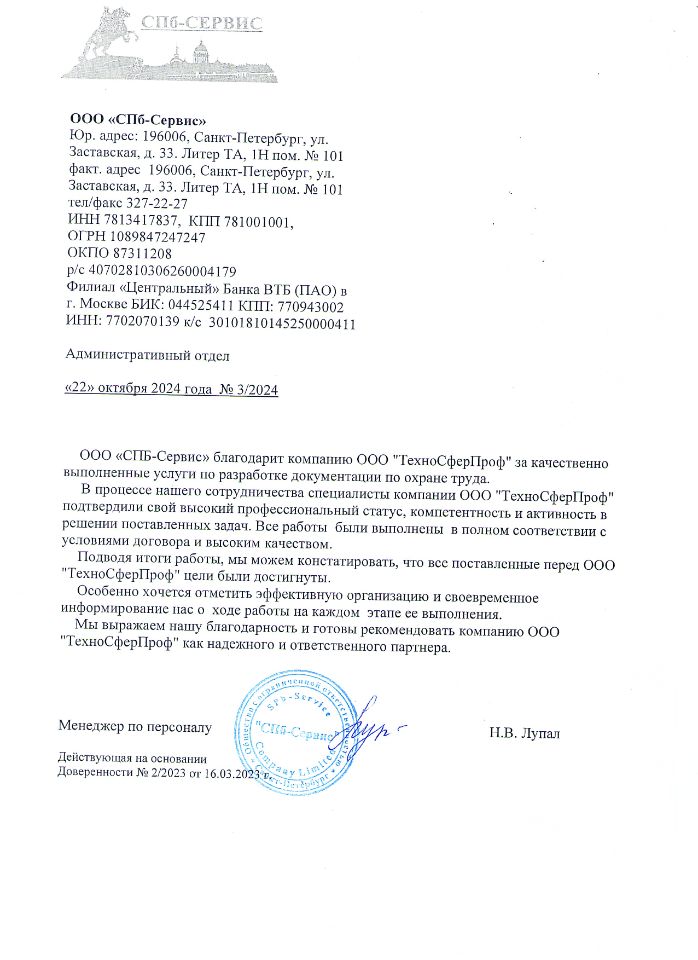 Все специалисты компании ТехноСферПроф имеют высшее образование по специальностям "Техносферная безопасность", "Безопасность технологических процессов и производств". Практический опыт отдельных специалистов в области охраны труда достигает 15 лет непрерывной работы.