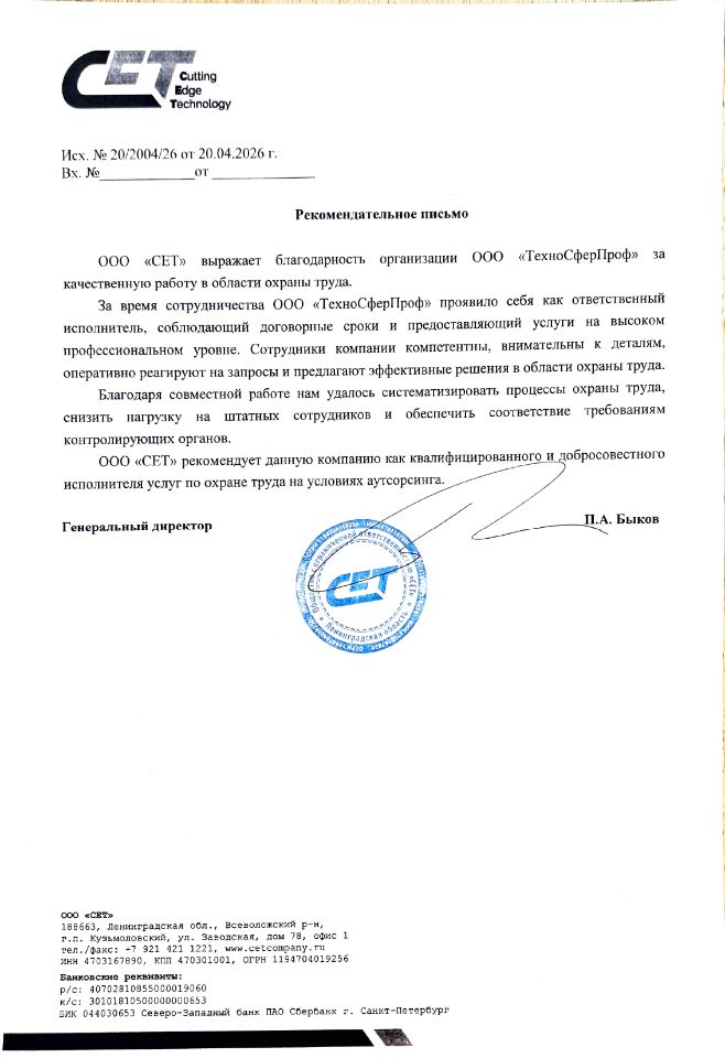 Все специалисты компании ТехноСферПроф имеют высшее образование по специальностям "Техносферная безопасность", "Безопасность технологических процессов и производств". Практический опыт отдельных специалистов в области охраны труда достигает 15 лет непрерывной работы.